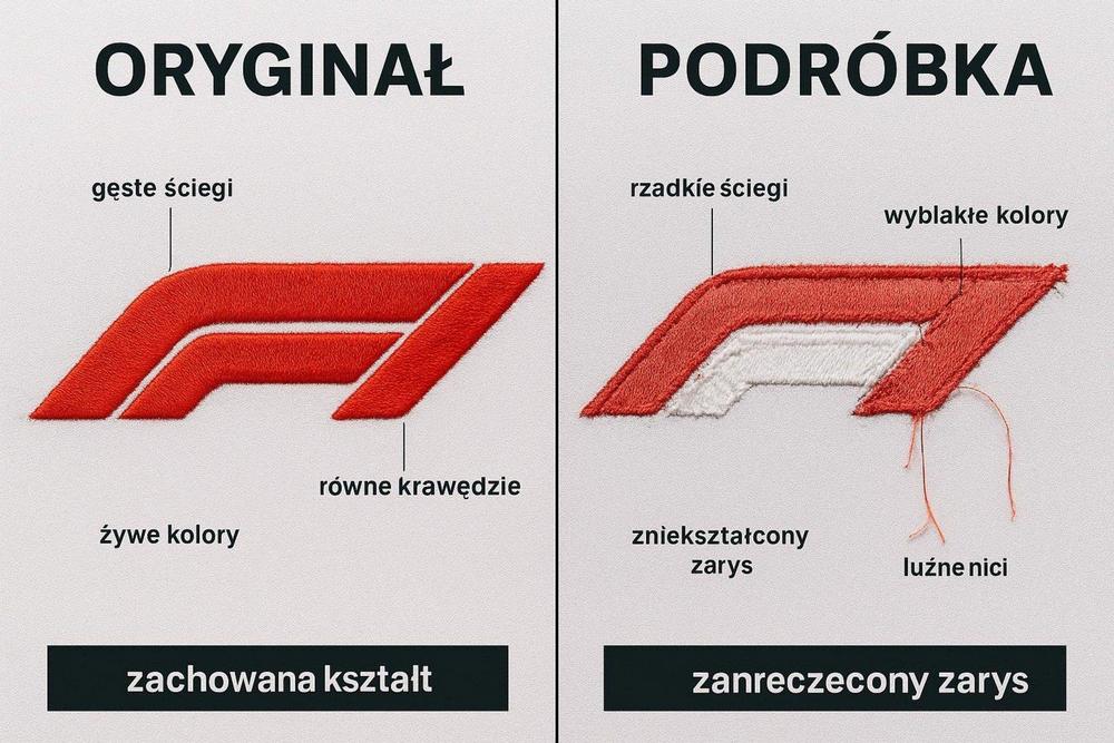 Logotypy, nadruki i naszywki to wizytówka odzieży F1 i jeden z głównych punktów, które warto dokładnie obejrzeć. Na oryginalnych ubraniach loga zespołów (Scuderia Ferrari, Red Bull Racing, Mercedes-AMG Petronas F1 Team itd.) i sponsorów są ostre, czytelne, w prawidłowych kolorach i proporcjach. Haft jest gęsty, równy, bez wystających nitek czy „przerw” w wzorze.
